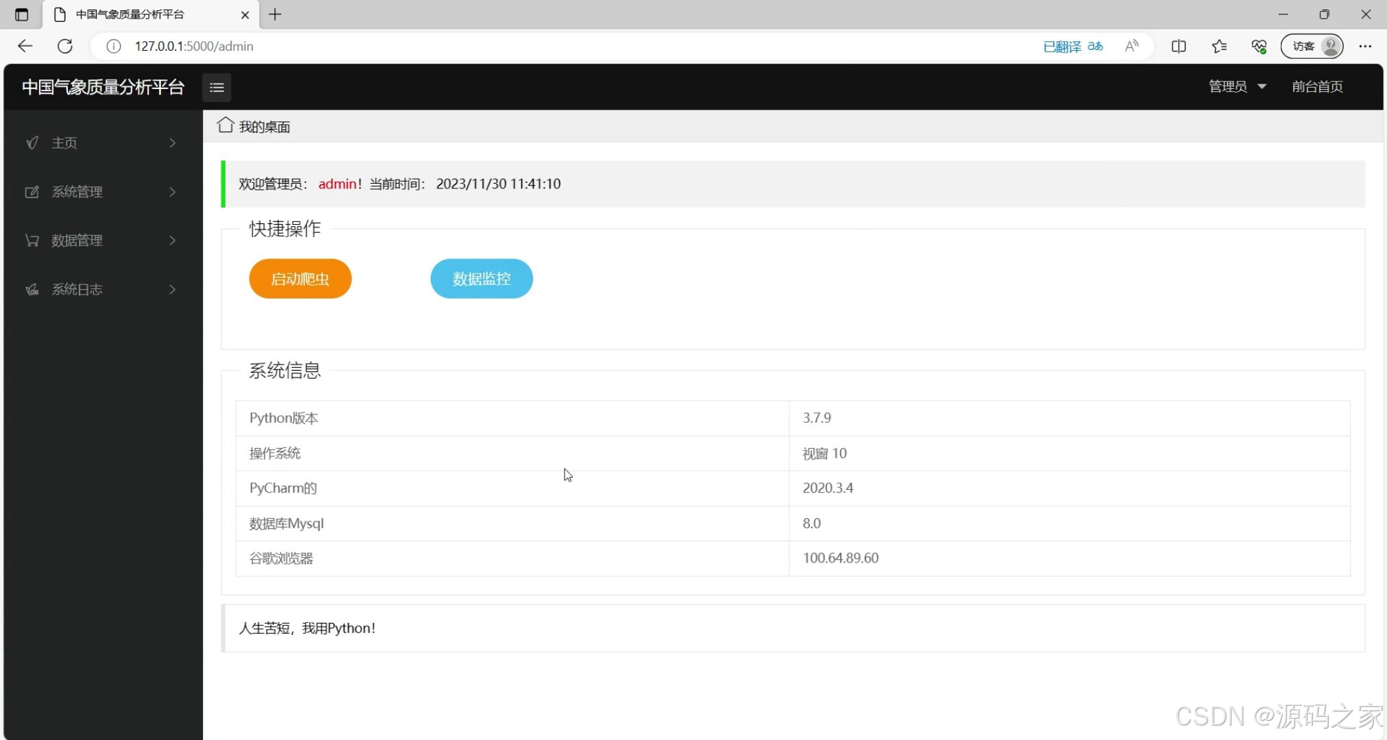 该页面是中国气象质量分析平台的管理员后台首页,展示管理员欢迎信息与当前时间,提供启动爬虫、数据监控的快捷操作入口,同时呈现系统运行的相关环境信息,方便管理员进行系统运维与数据采集操作。