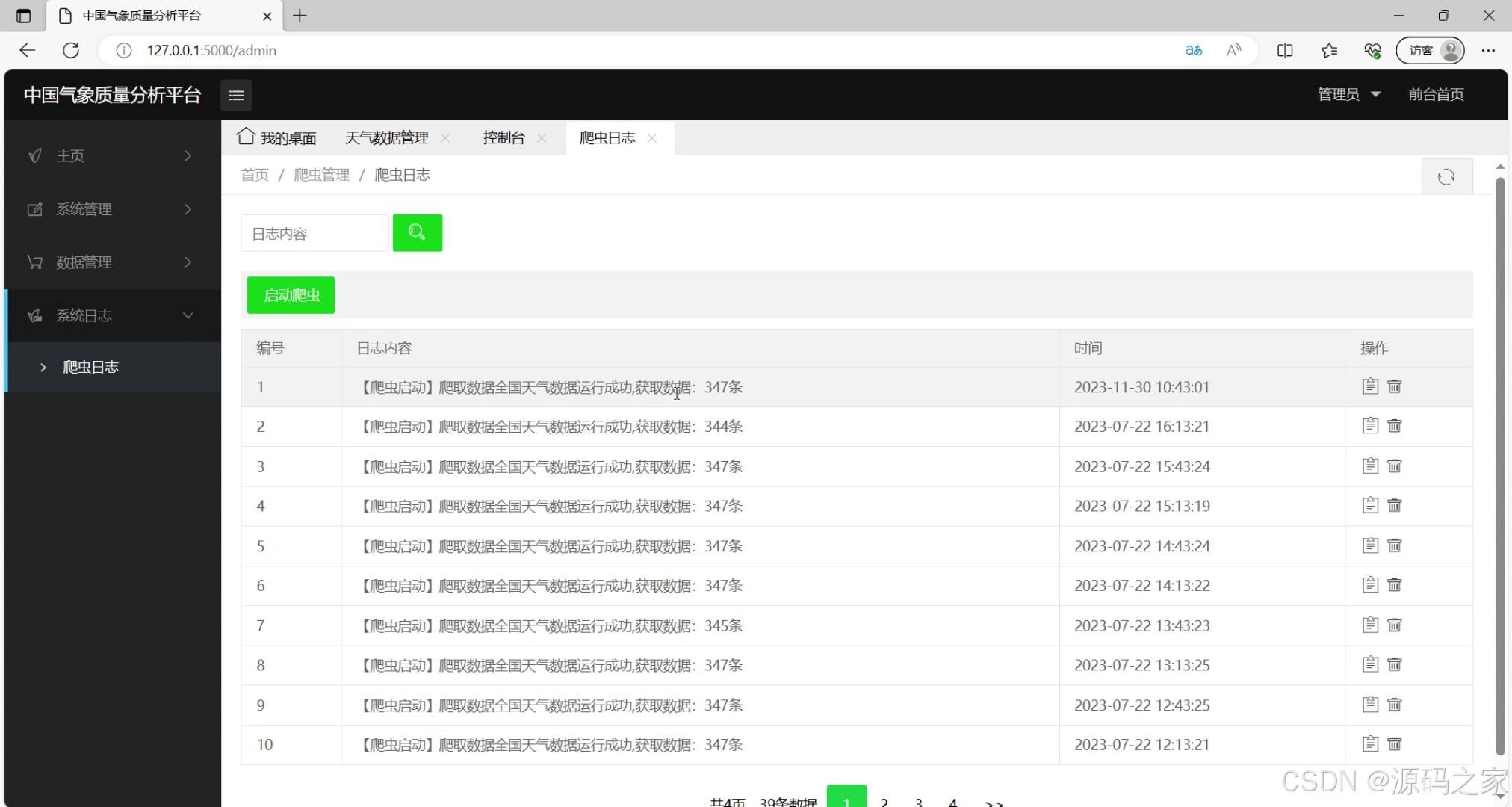 该页面是中国气象质量分析平台的爬虫日志管理模块,支持按日志内容检索爬虫运行记录,以表格形式展示每一次爬虫任务的编号、日志详情和执行时间,提供分页功能,方便管理员追溯爬虫运行状态与结果。