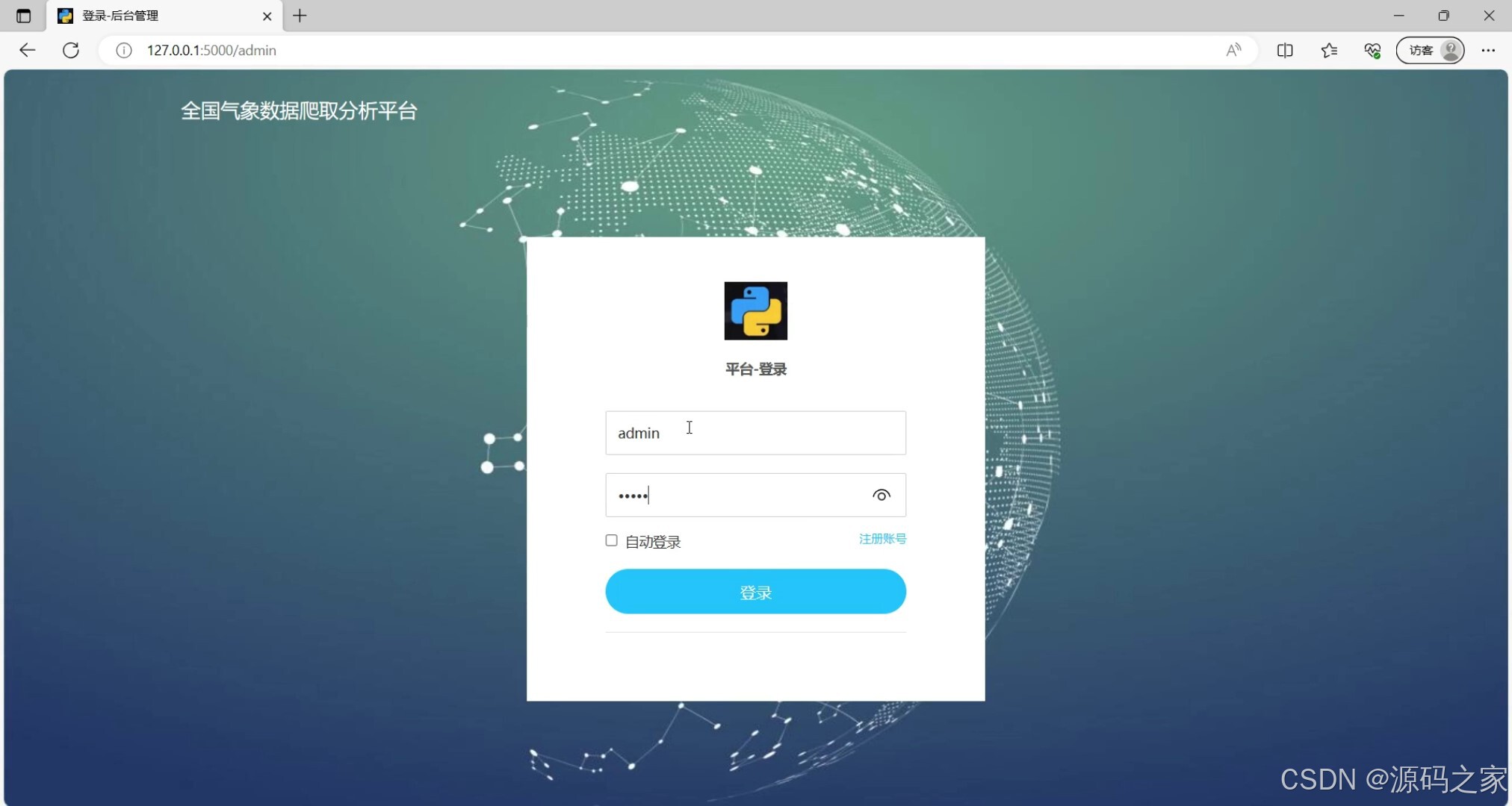 该页面是全国气象数据爬取分析平台的后台登录界面,提供账号密码输入区域,配备自动登录选项、登录按钮与注册账号入口,用于管理员身份验证,是进入系统后台的专属入口,保障系统操作的权限安全。