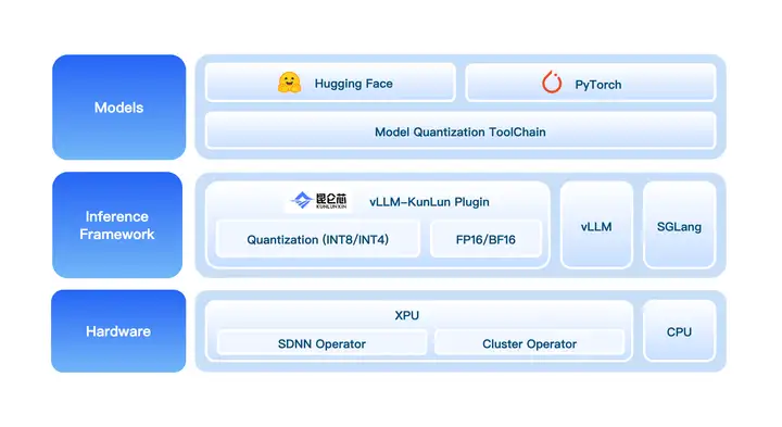 为实现高性能模型的快速开发与适配,百度百舸联合昆仑芯开发了 vLLM-Kunlun Plugin,将 vLLM 社区版与昆仑芯 XPU 后端完全解耦。用户通过 vLLM-Kunlun Plugin,快速适配主流开源模型。
