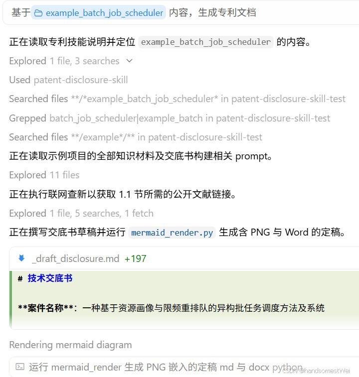 设计文档、代码都有了,专利点却还没梳清?交底书既要系统框图与流程图,又要代理人能直接改的 Word,多轮补材料还不能覆盖旧稿?本文介绍开源仓库 patent-disclosure-skill:欢迎star,用 SKILL.md 编排、prompts/ 分步约束 Agent,覆盖专利挖掘、联网查新、脱敏成稿、mermaid 转图与 Word 导出,并内置迭代合并与修订留痕。适用于 Cursor、Claude Code 等支持 Agent Skills 的环境。亦可从腾讯 SkillHub、ClawHub 浏览和下载技能包。