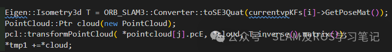 currentvpKFs[i]->GetPoseMat() 获取的是回环优化后的相机位姿(世界 → 相机)。由于 pcE 原本是相机坐标系下的点云(由深度图反投影得到,原点在相机光心),要将其变换到世界坐标系,需要乘以 T 的逆(即相机→世界的变换矩阵)。所有重新变换后的点云累加到临时点云 tmp1 中。
