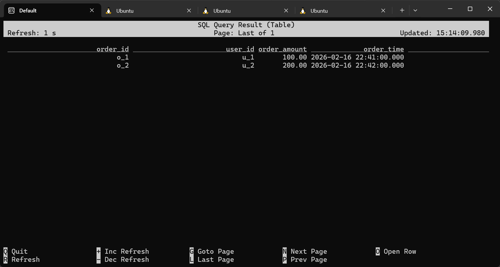 这里的字段名、时间格式都要和前面建表时定义的一致,这样 Flink 才能正确反序列化 JSON 并进行双流 JOIN。