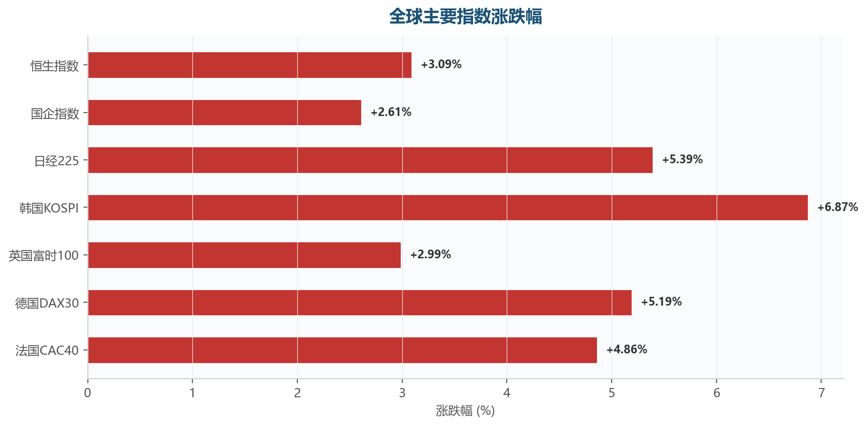 大幅波动:恒生指数 +3.09%,国企指数 +2.61%,日经225 +5.39%,韩国KOSPI +6.87%