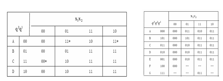 即允许状态编码有非临界竞争出现。例如左边表格中给定的四个状态, 利用临界竞争编码得到的编码表 如右边表格。当增加E、G、F三个新状态后,就可以使它们之间的竞争全部化为非临界竞争