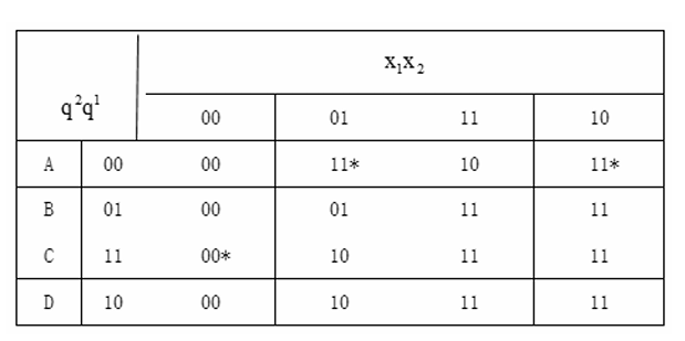 例如表中在(01)输入下,(11)与(10)有相同的次态且(11)与(10)相邻,则可用(10)代替(11),并不影响外 部性能,从而使存在临界竞争的转换(00) → (11) 变为无竞争的转换(00) →(10)