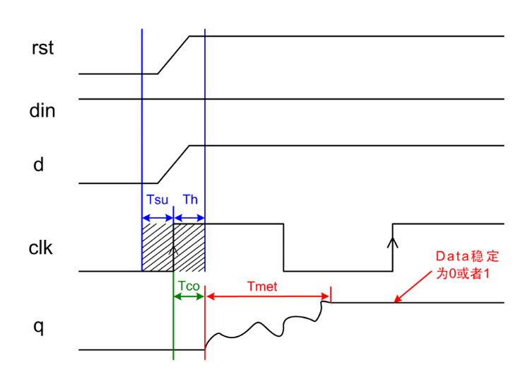 亚稳定状态:在同步系统中,如果触发器的建立时间和保持时间不满足,就可能进入亚稳态,此时触发器输出端Q在有效时钟沿之后比较长的一段时间处于状态1和状态0之间的不确定状态,即亚稳定状态