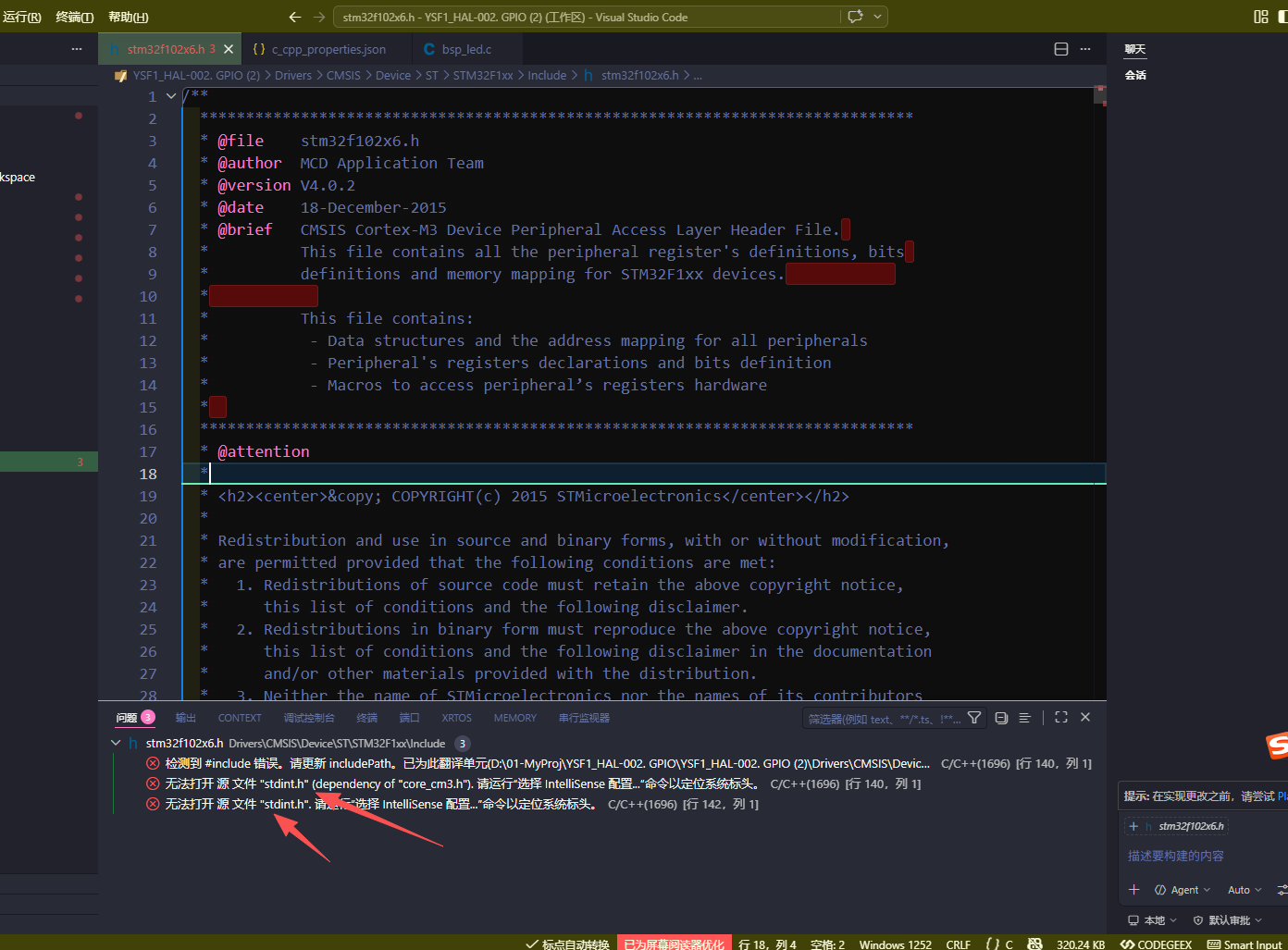 修改c_cpp_properities.json文件后,问题窗口的错误为: