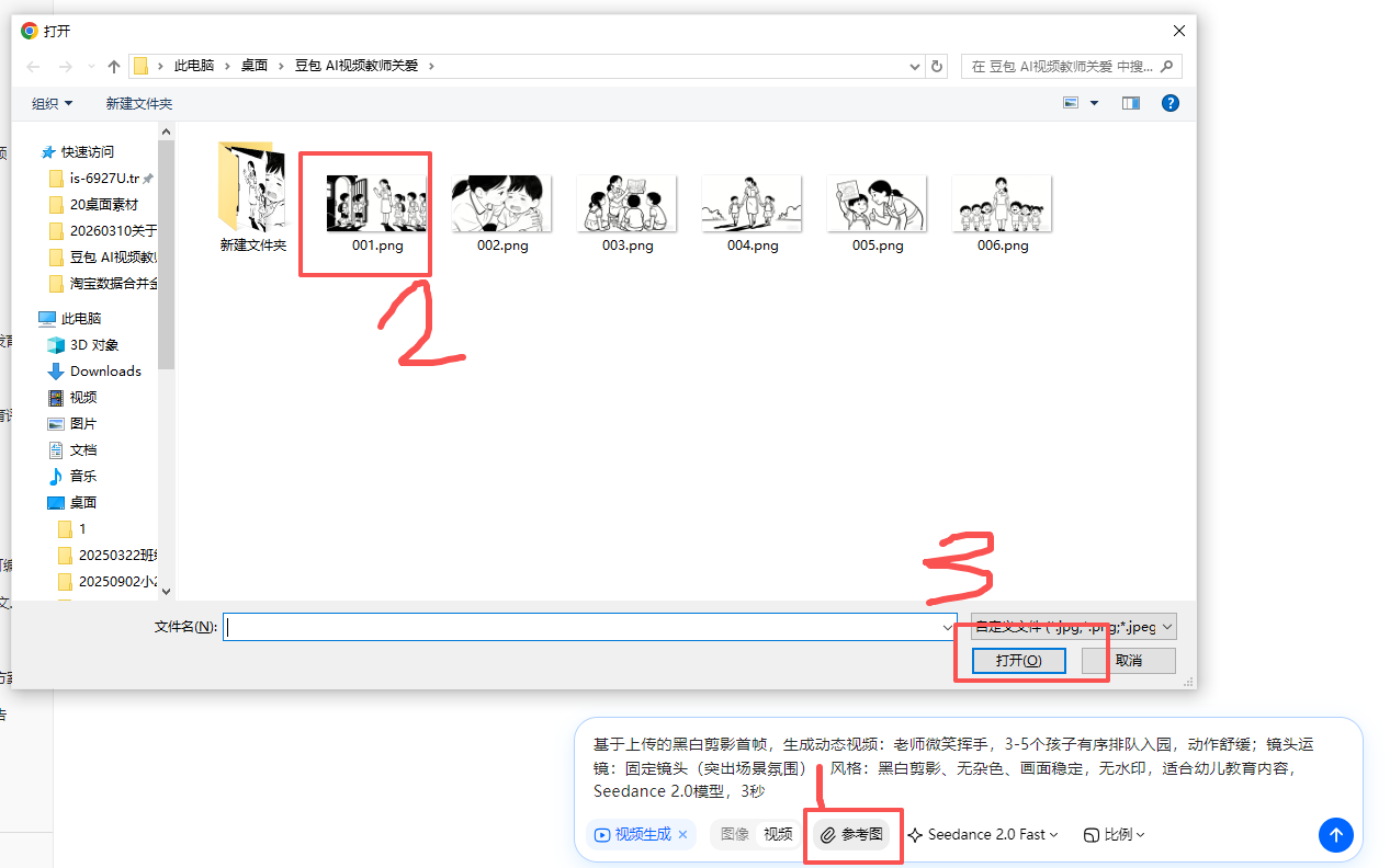- 上传参考图:点击界面中的【上传参考图】按钮,选择刚才保存的首帧剪影(重点!每生成一段都要上传,保证角色风格统一);