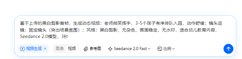 基于上传的黑白剪影首帧,生成动态视频:老师微笑挥手,3-5个孩子有序排队入园,动作舒缓;镜头运镜:固定镜头(突出场景氛围);风格:黑白剪影、无杂色、画面稳定,无水印,适合幼儿教育内容,Seedance 2.0模型,3秒