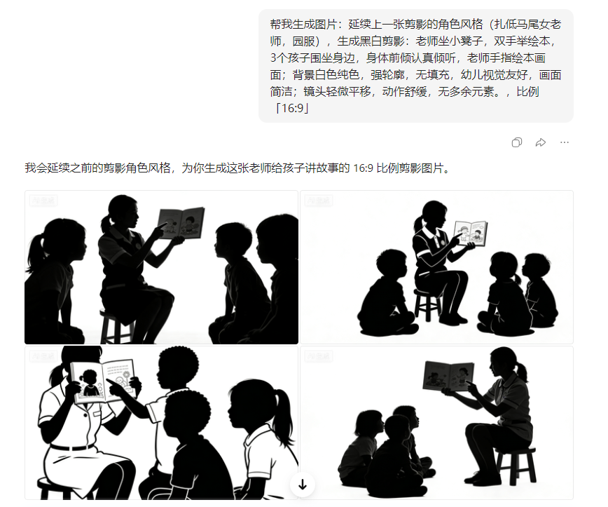 基于上传的黑白剪影首帧 ,生成动态视频:【替换为动作描述,如 "老师缓慢抬手翻绘本,孩子身体前倾倾听"】;镜头运镜:缓慢推近 (突出表情);风格:黑白剪影、无杂色、画面稳定,无水印,适合幼儿教育内容。