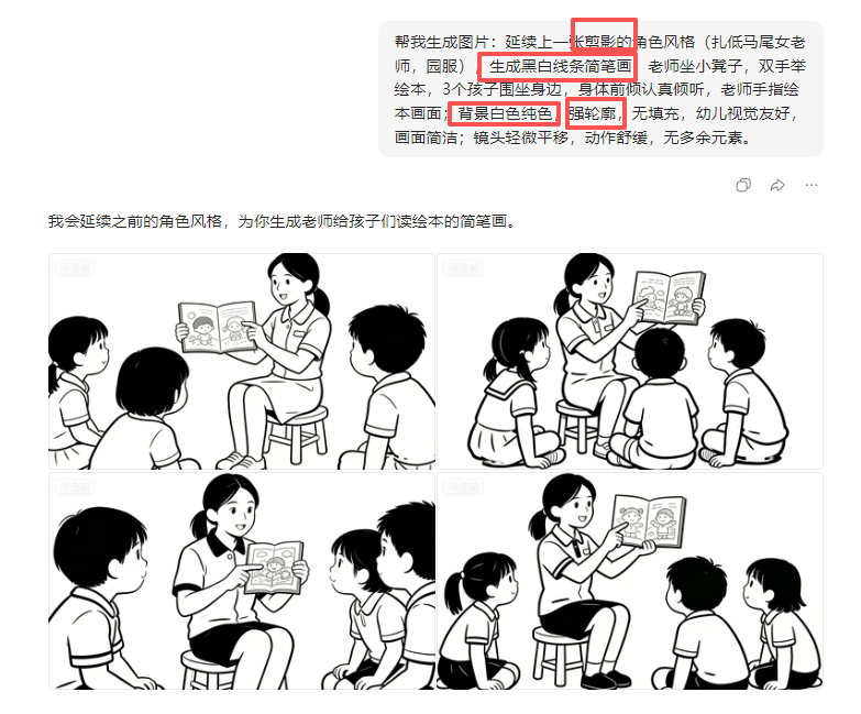 - 角色设定:固定老师形象(如 "扎低马尾的女老师,简约园服,温柔站姿"),避免造型多变。