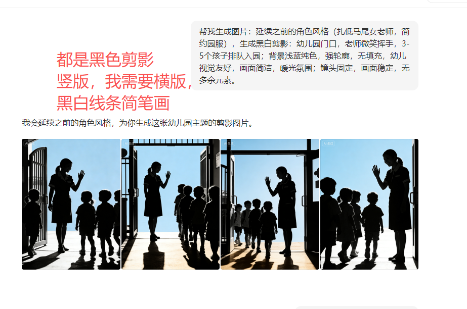 - 结尾:1 个收束镜头(老师与孩子牵手剪影 + 标语 "用爱守护,用心教育");要求:人物统一为幼儿园女老师 (扎低马尾 / 简约园服),孩子 3--5 岁,画面简洁无杂色,突出剪影轮廓与动作,字幕简洁暖心。