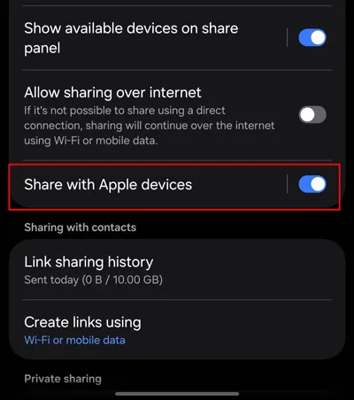 在安卓设备 上,前往"设置",选择"已连接的设备 ">"快速共享 ",确保"与苹果设备共享 "已开启 。将可见范围设置为"所有人"。