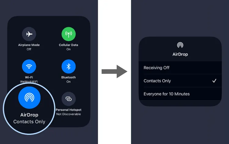 在 iPhone 上,向下滑动打开"控制中心 ",长按网络设置块,将 AirDrop 设置为"所有人,持续 10 分钟"。