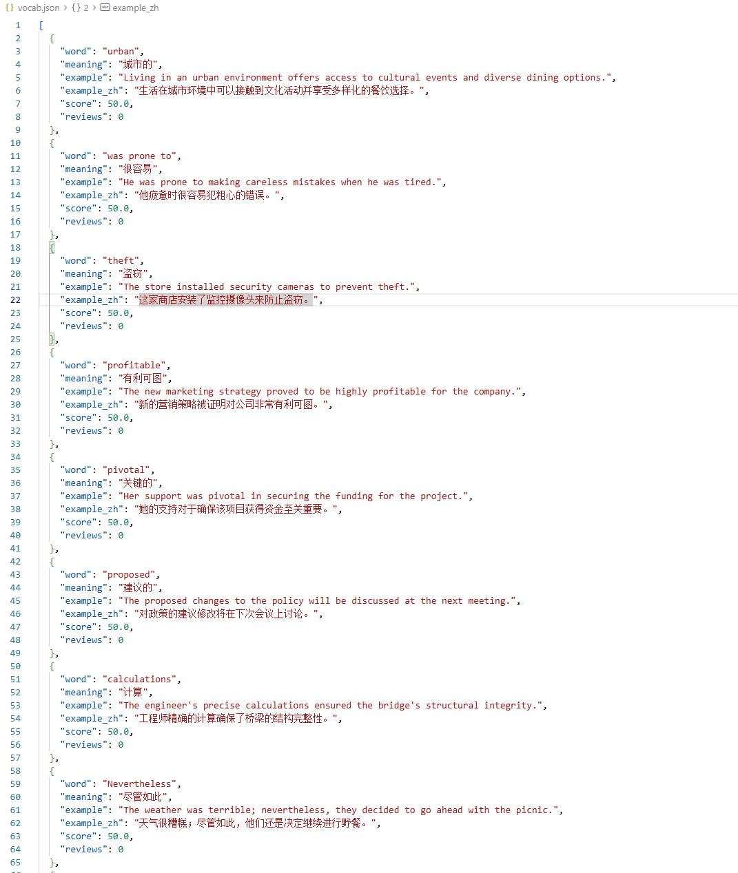 vocab.json,形成"释义 + 语境 + 译文"的完整学习材料