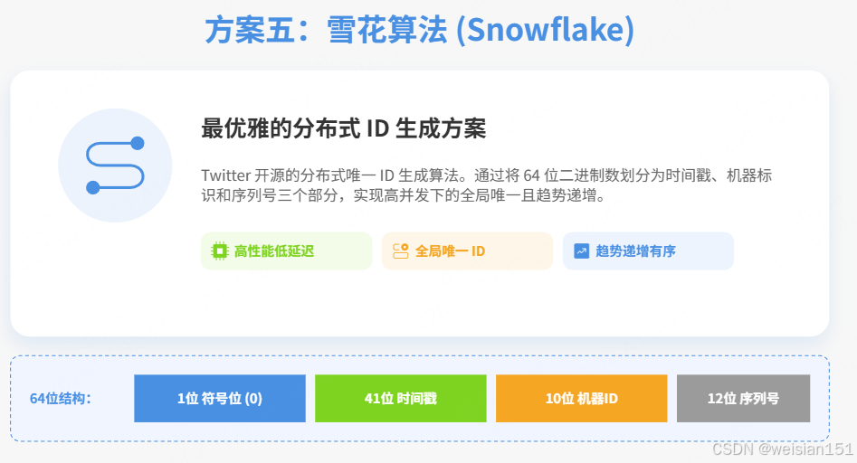 - 雪花算法:最优雅方案,本地生成、高性能、趋势递增;