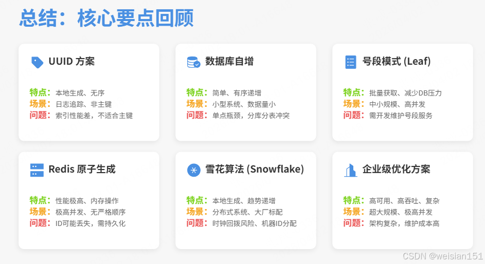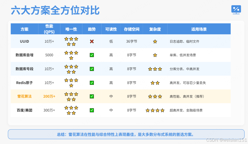 ✅ 六大方案全方位对比:性能、唯一性、趋势递增、可读性;