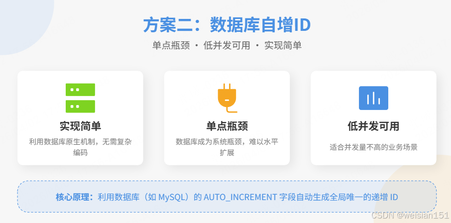 三、方案二:数据库自增ID(单点瓶颈,低并发可用)