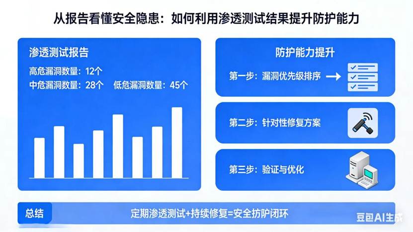 总结来说,利用渗透测试结果提升防护能力,核心是"看懂隐患、精准整改、长效防护"。渗透测试报告不是一次性文档,而是企业安全防护的"工具书",只要读懂报告、落地整改、建立长效机制,就能逐步提升防护能力,从根源上抵御黑客攻击,守护企业网络安全。