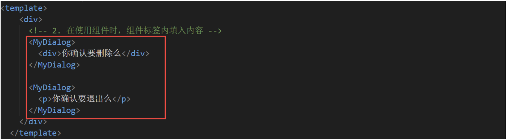 注意这里的是默认插槽,也就是子组件只有一个插槽的情况下,可以直接在使用子组件的时候加内容。