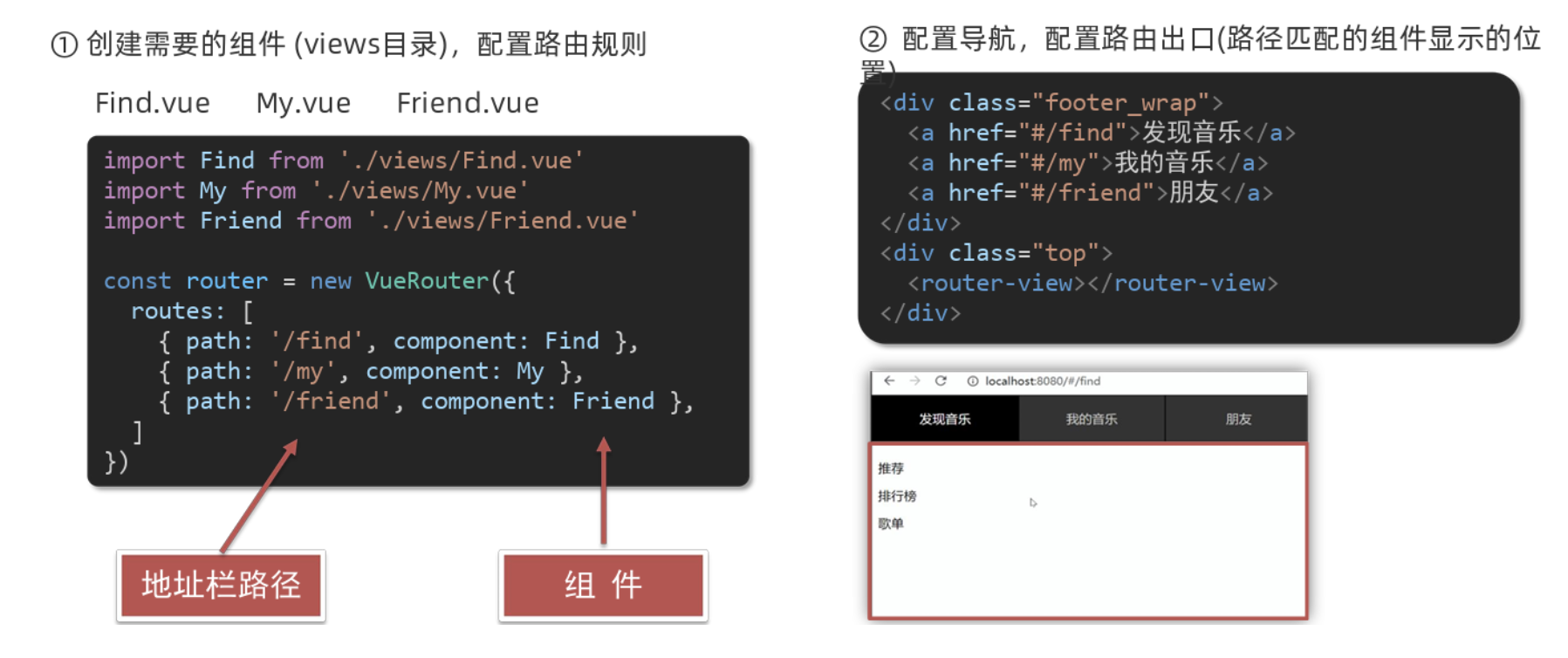 在main.js的VueRouter实例中进行路由规则的编写,再在App主组件中进行导航的配置,实现跳转入口的实现;