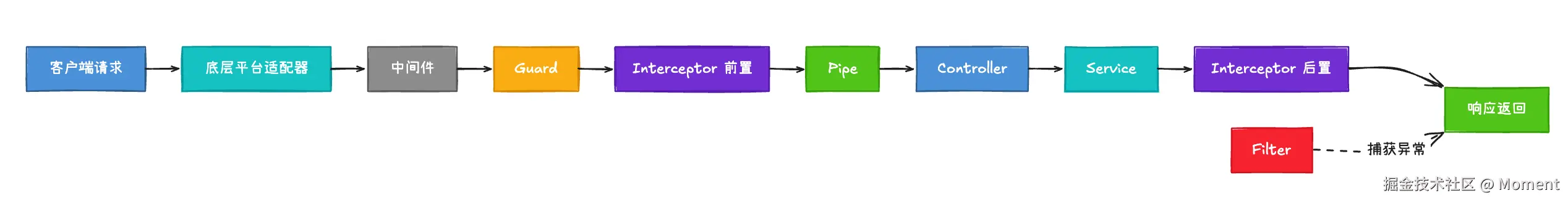 看图时不必一次记全细节,但可以先抓住一点,NestJS 处理请求不是请求一进控制器就立刻返回这么简单,它把校验、权限、拦截、异常处理这些公共逻辑明确插进了请求生命周期。