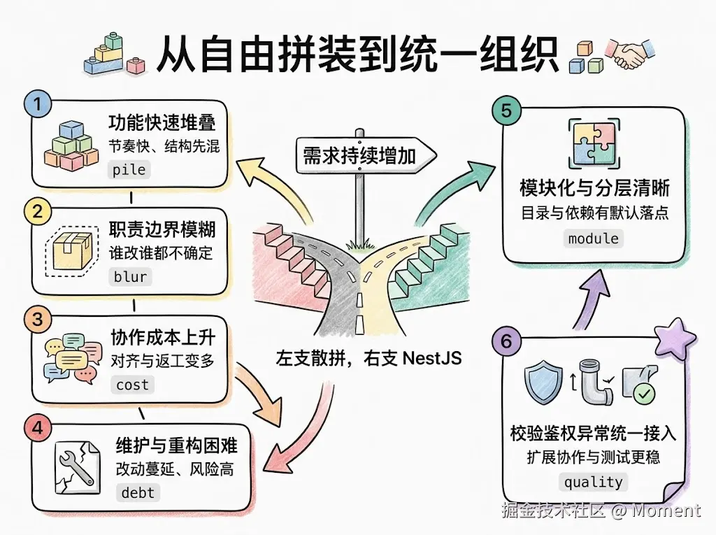 换句话说,NestJS 想解决的不只是怎样把一个接口写出来,而是下面这些更接近长期项目本质的问题: