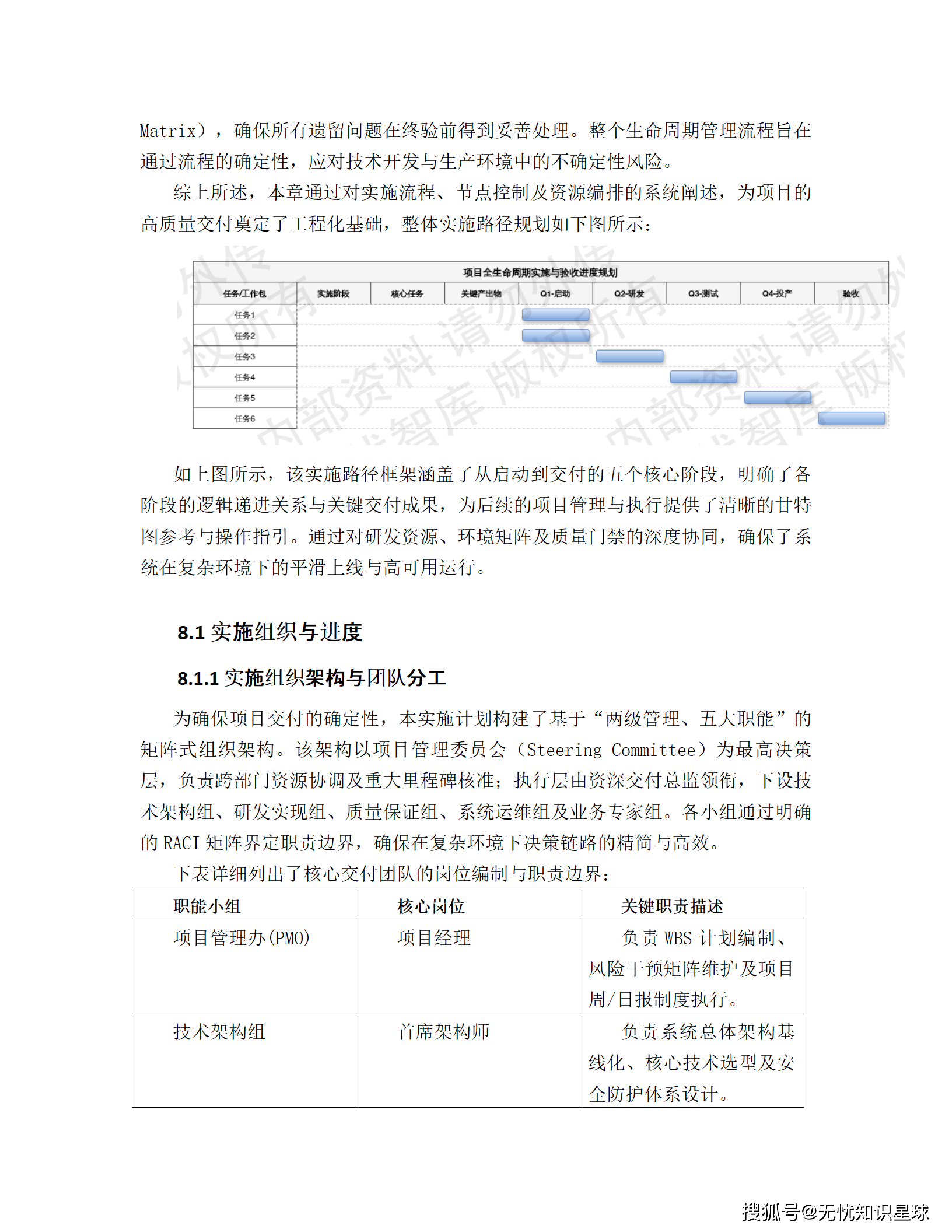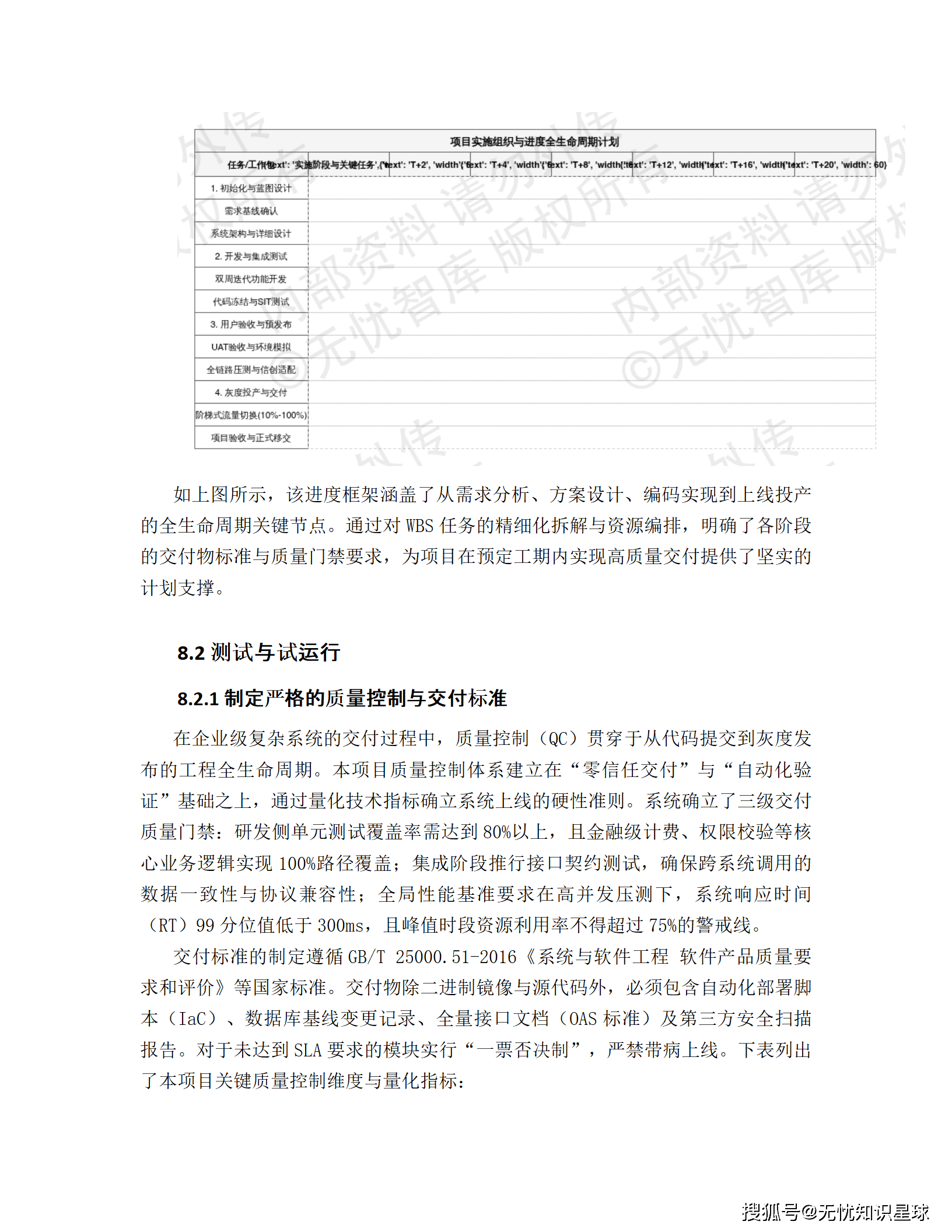 - 混合交付模式: 结合敏捷迭代与瀑布计划,工期划分为四大里程碑:蓝图设计(4周) -> 开发集成(12周) -> 验收预发布(4周) -> 灰度投产(4周)。