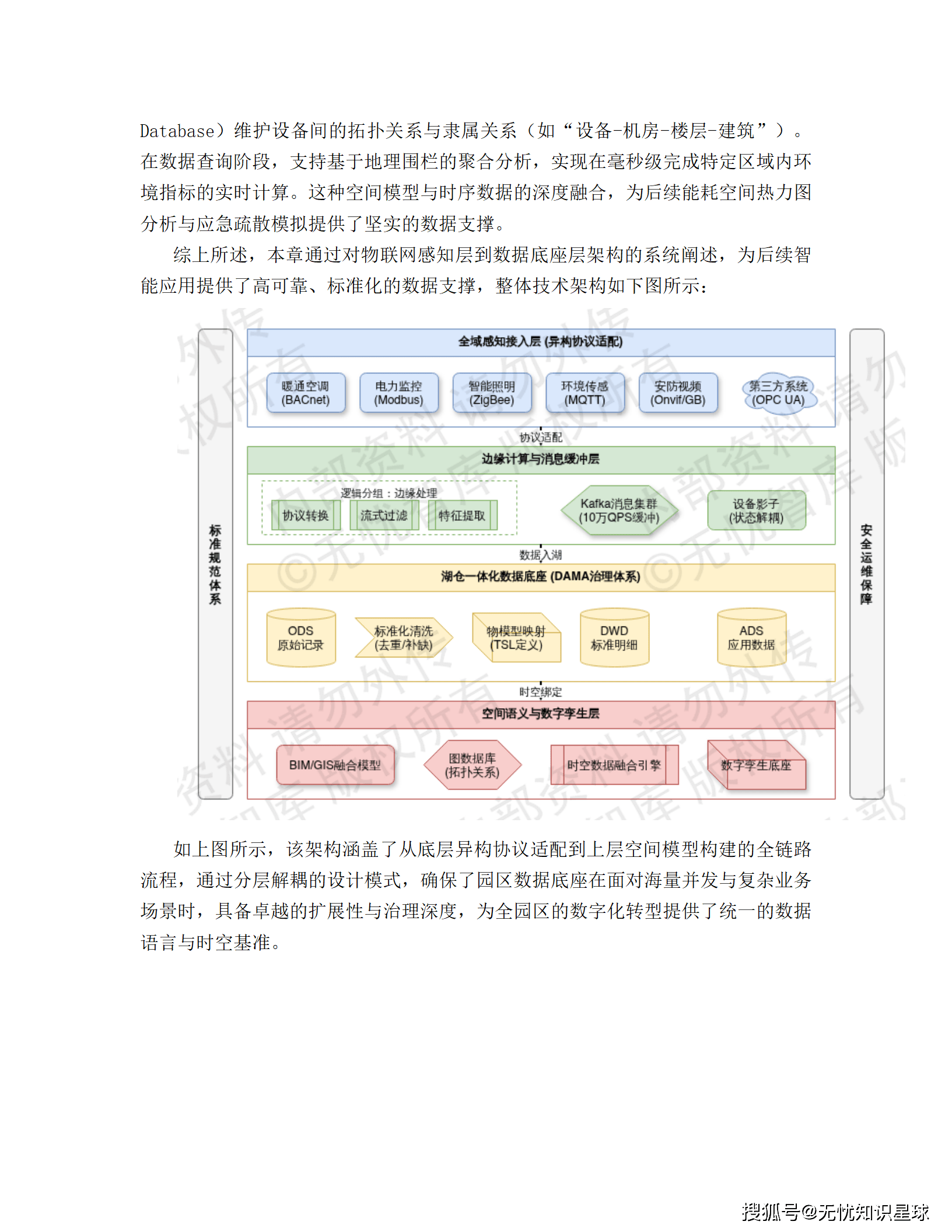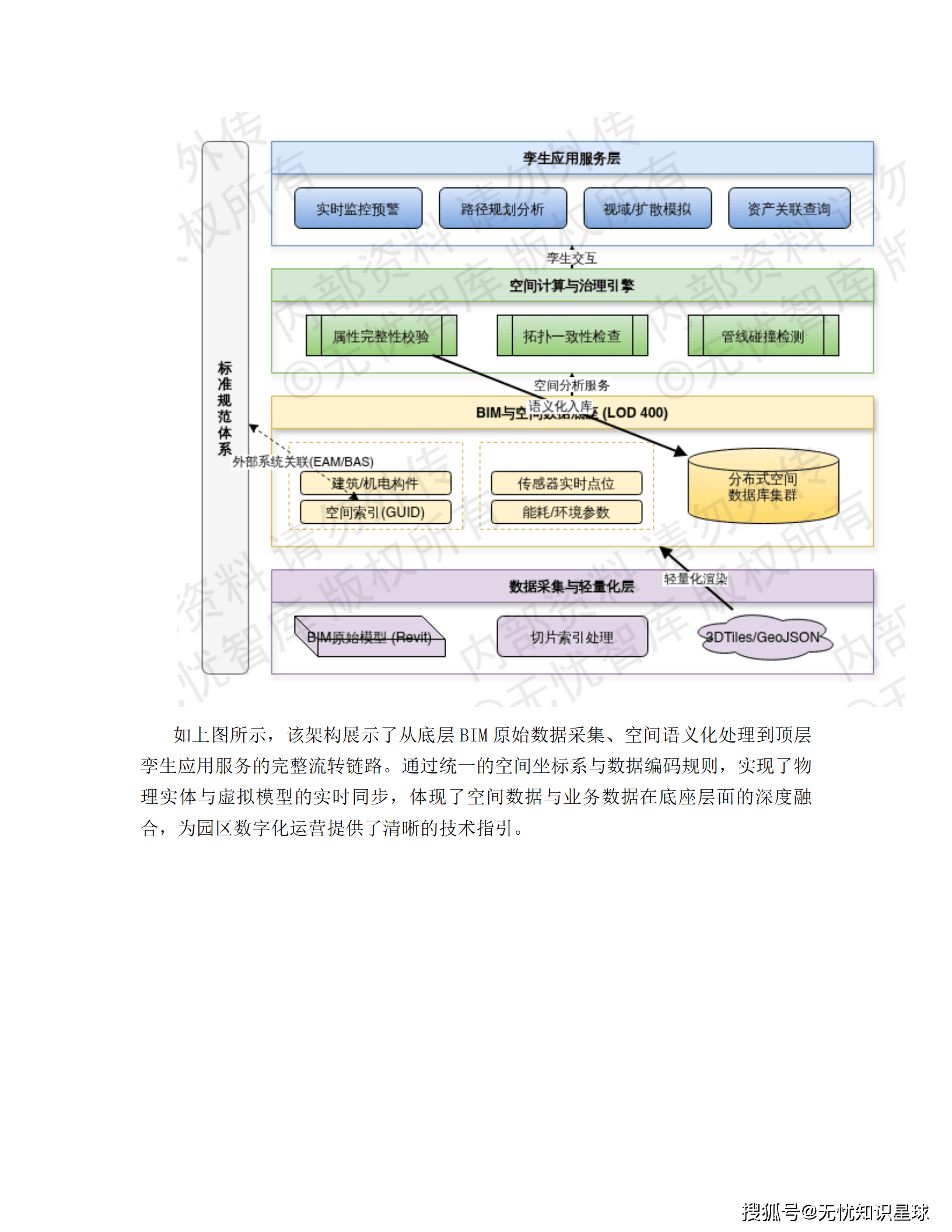 - BIM与空间底座: 采用 LOD 400 建模精度,结合 IFC 标准与 3DTiles 轻量化格式。通过空间语义索引,实现"设备-机房-楼层-建筑"的拓扑关联,支撑毫秒级的空间热力图分析。