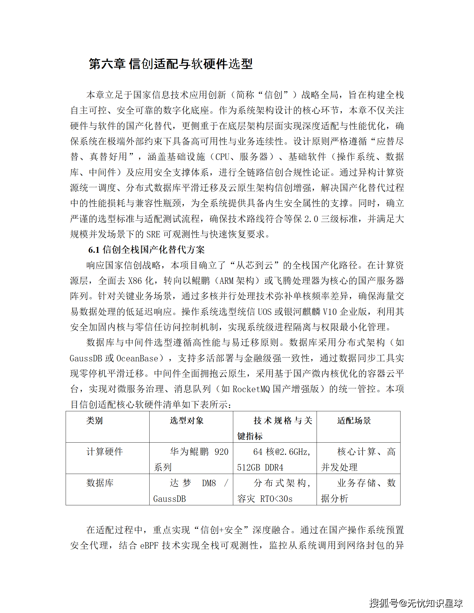 - 软件层: 操作系统选用 统信UOS 或 麒麟 ;数据库采用 GaussDB 或 OceanBase,支持金融级强一致性。
