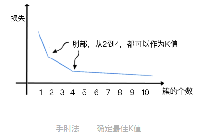 你看图中,损失随着簇的个数而收敛的曲线大概像个手臂,最佳 K 值的点像是一个手肘,这就是为什么我们会叫它"手肘法"的原因。
