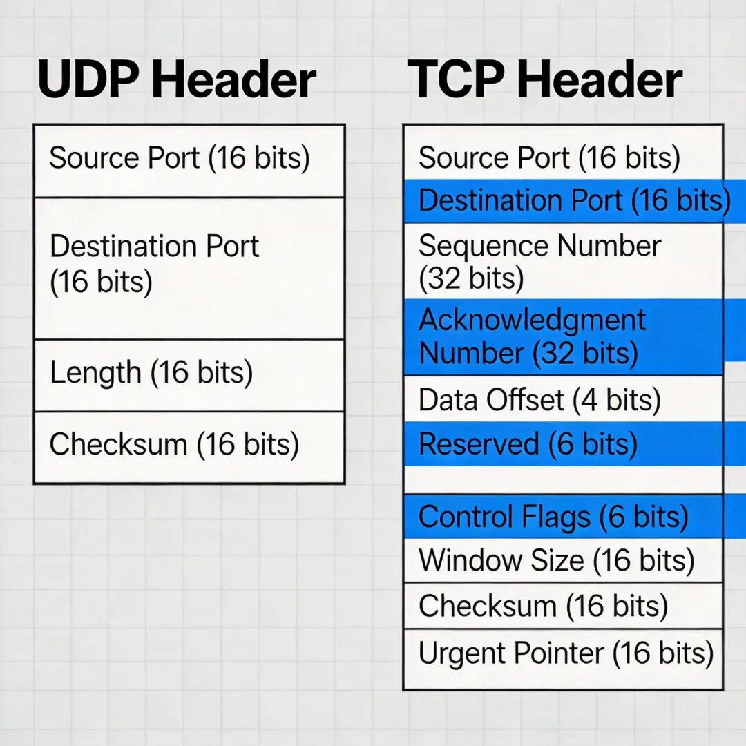 UDP 首部格式与 TCP 首部格式对比表,直观展示二者首部长度与字段差异