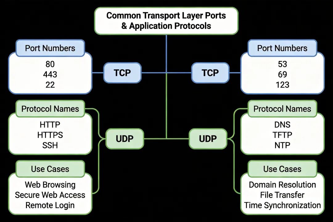 常用传输层端口与应用层协议对应关系思维导图,按 TCP/UDP 分类展示核心端口