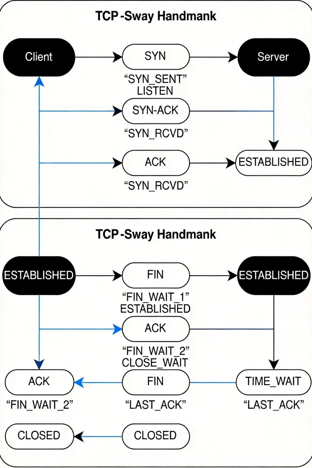 TCP 三次握手与四次挥手状态转换图,标注每个阶段的报文结构与双方状态变化