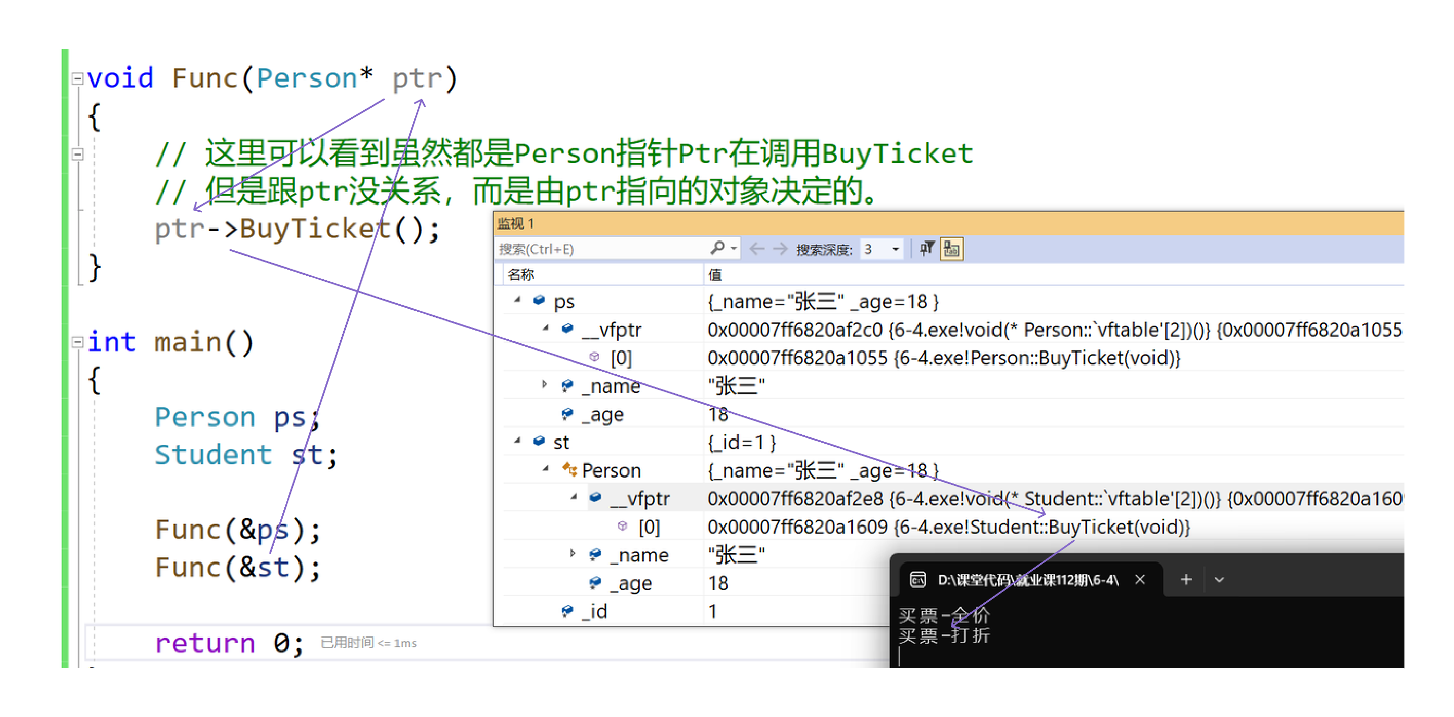 从底层的角度来看,在 Func 函数中执行 ptr->BuyTicket() 时,系统是如何做到"指向 Person 对象就调用 Person::BuyTicket,指向 Student 对象就调用 Student::BuyTicket 的呢?