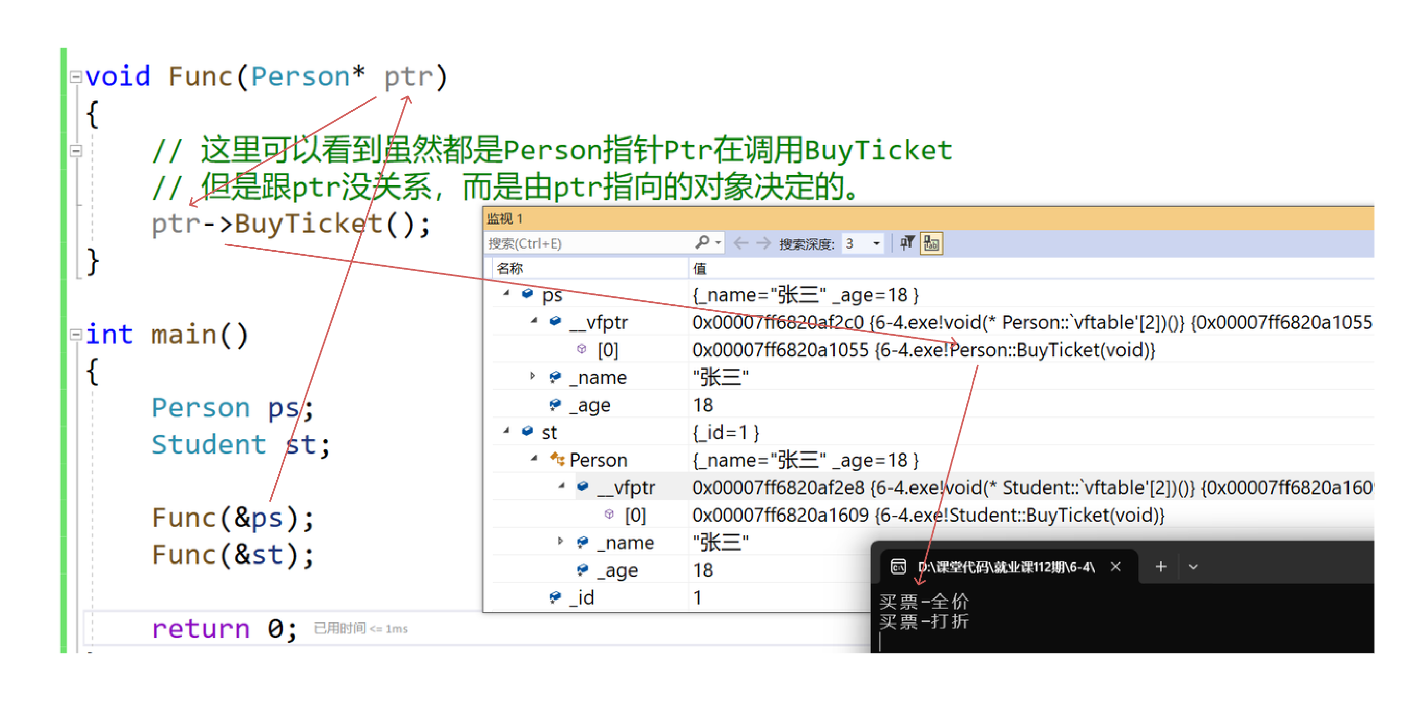 ptr中的vptr找到Student的虚表,调用的是Student的虚函数。