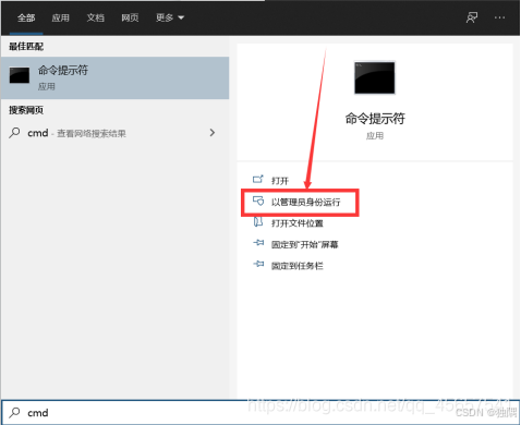 - 1、使用管理员权限进入win10的命令模式,使用系统搜索cmd,然后使用管理员模式打开,如下图
