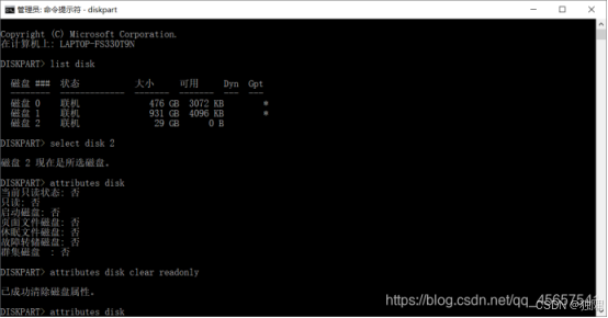 - [6、接下输入list disk 命令,查看磁盘编号,可以根据磁盘大小来查看你要更改的磁盘属性](#6、接下输入list disk 命令,查看磁盘编号,可以根据磁盘大小来查看你要更改的磁盘属性)