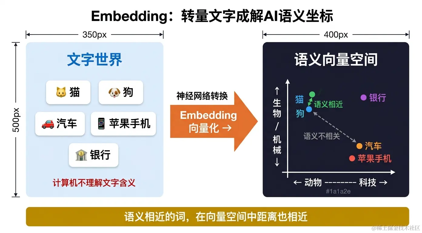 Embedding = 把文字转成"语义坐标",让 AI 能理解文字的含义而不只是字符匹配。它是语义搜索、RAG 知识库、告警聚合、内容推荐等 AI 应用的核心基础技术。