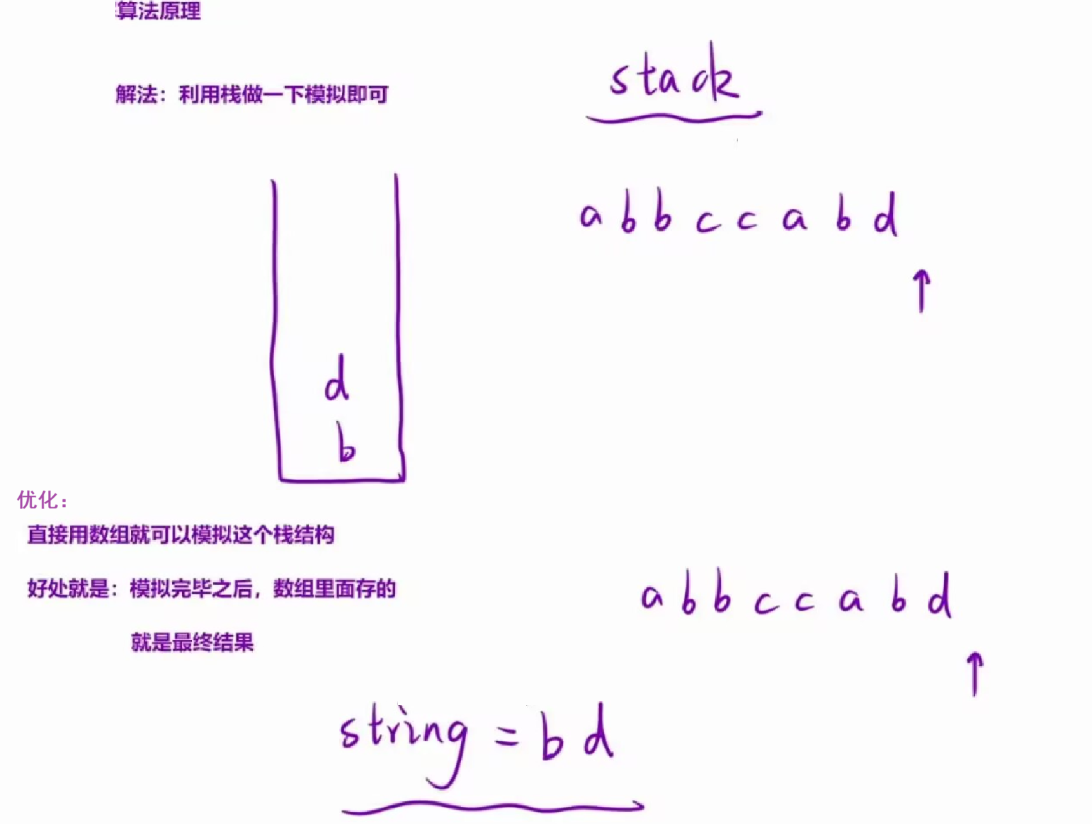 但是,如果使用stack来保存的话,最后还需要把结果从栈中取出来。不如直接用「数组模拟一个栈」结构:在数组的尾部「尾插尾删」,实现栈的「进栈」和「出栈」。那么最后数组存留的内容,就是最后的结果。