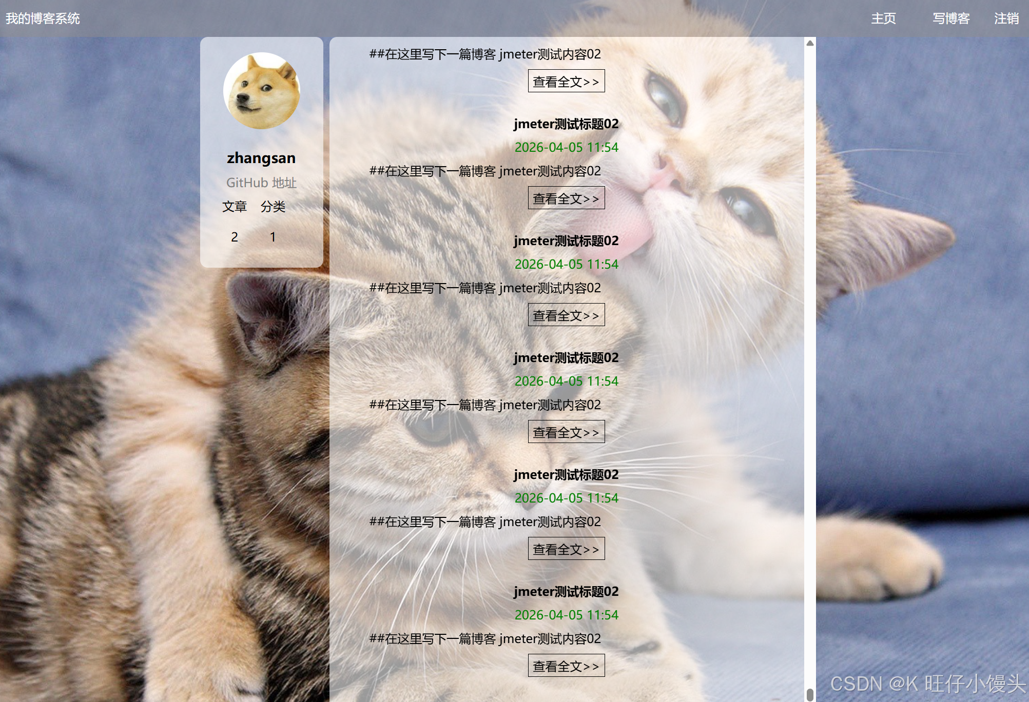 登录后进入博客首页,页面展示所有博客的标题、发布时间和内容简介。页面右上角有主页、写博客、注销三个按钮: