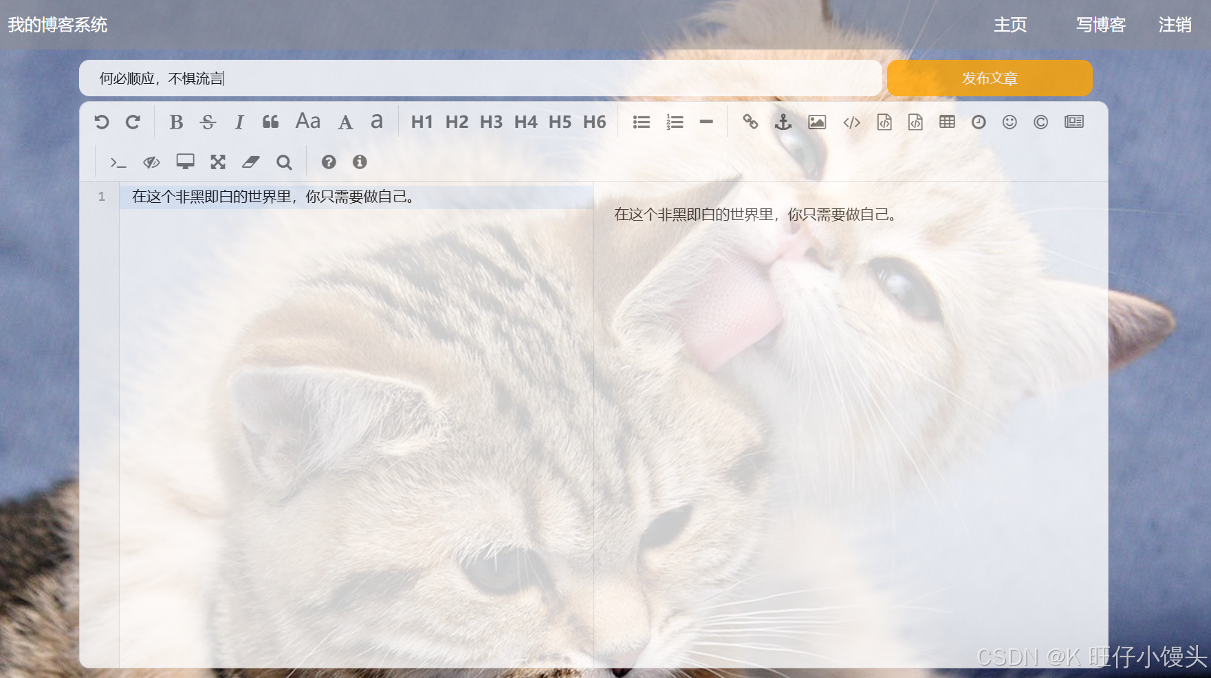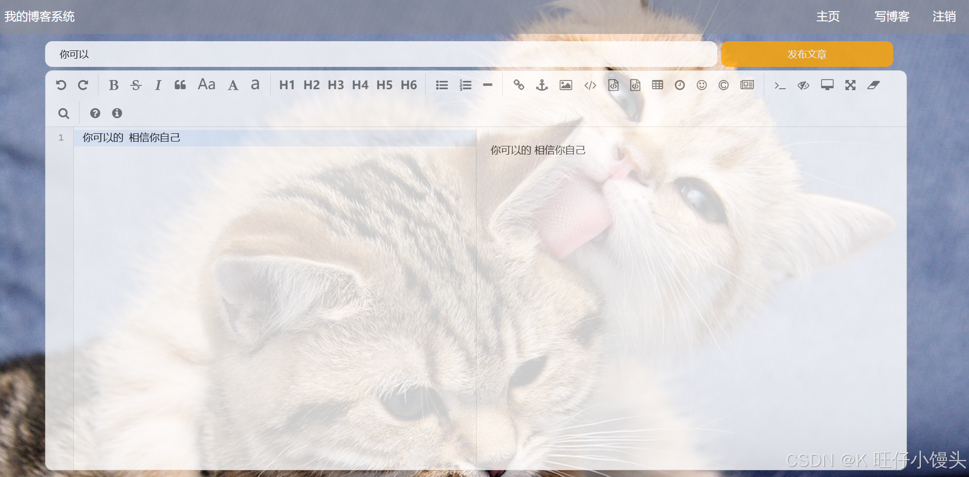 在登录状态下,点击任意页面的 "写博客",进入博客编辑页面。可以输入博客标题和正文内容,编辑完成后点击 "发布文章",文章会保存并发布,发布成功后跳回博客首页,新博客会显示在列表中。