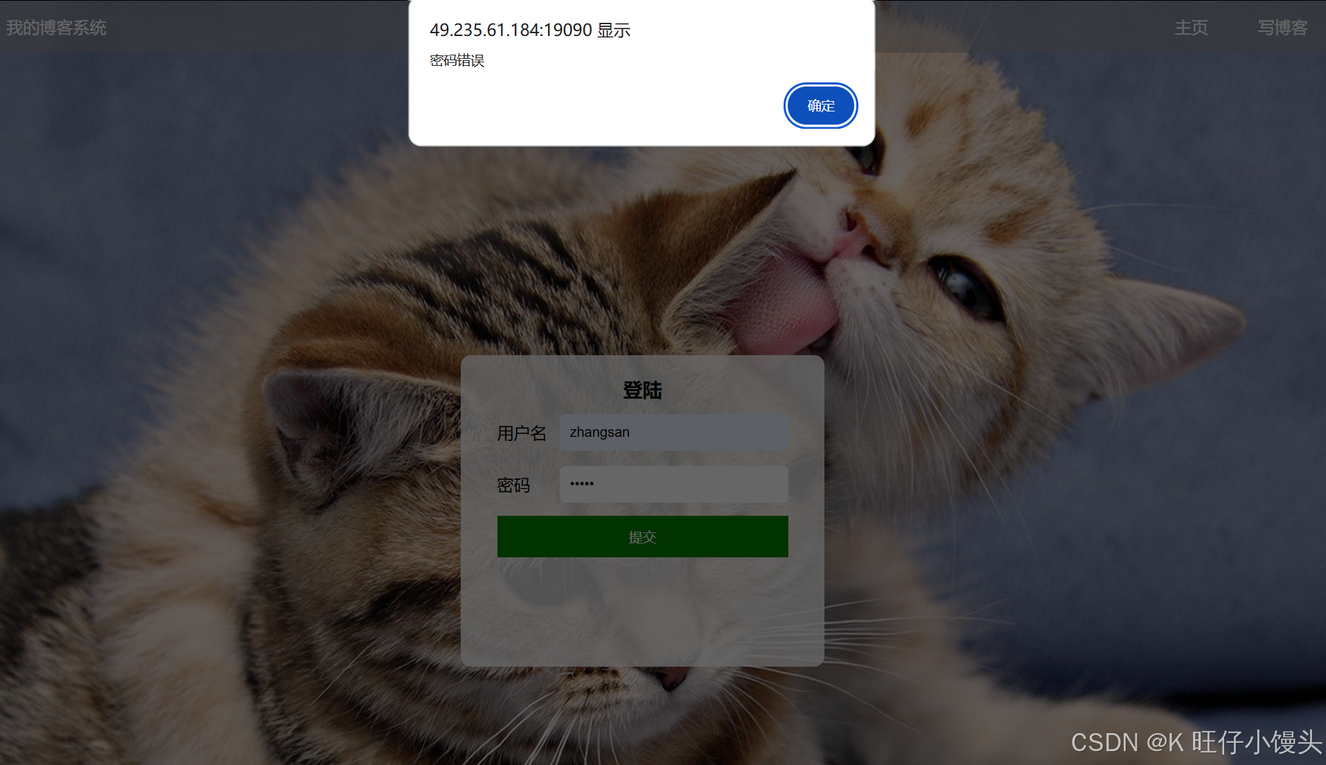 - 若输入正确的账号和错误的密码:(会有弹窗出现)