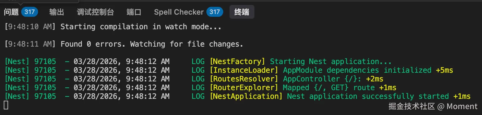 项目启动成功后,终端一般会看到类似 Nest application successfully started 的提示。默认情况下,服务会监听 3000 端口。