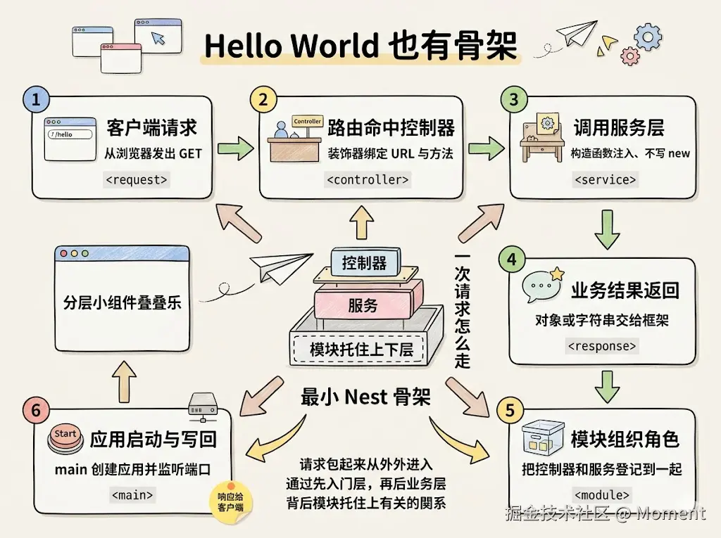 一个最简单的 Hello World 也能看出 NestJS 的分层习惯,请求不会随便落进某个函数,而是按约定往前走。最短路径可以先想成下面五步: