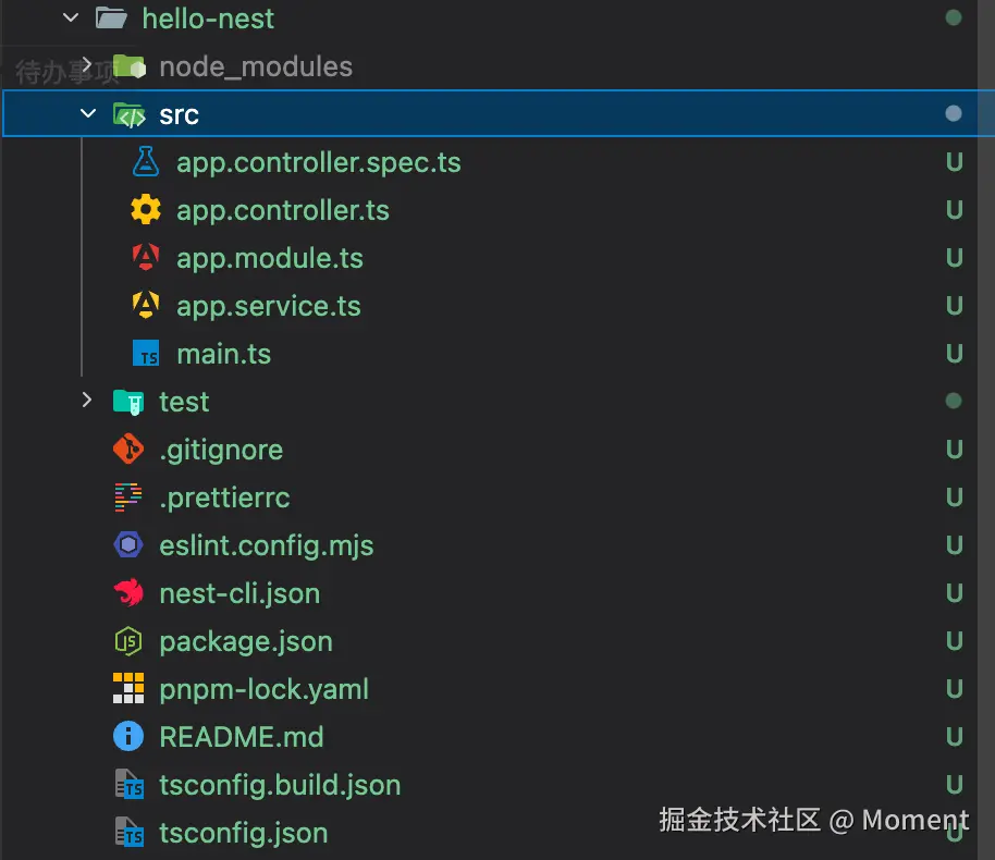 项目创建完成后,先不要急着写代码。更重要的是先看一眼默认目录结构,因为这会直接帮助你理解 NestJS 是怎么组织应用的。