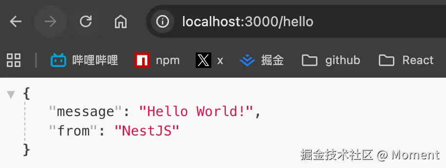 这和先把逻辑全塞进一个文件再说的写法差别很大,NestJS 从第一个接口就在推你把入口、业务和装配拆开。返回值具体写了哪句文案反而不那么重要,更值得留意的是三件事已经成习惯:入口和业务分开、依赖交给框架装配、结构按角色长而不是按临时想法堆。