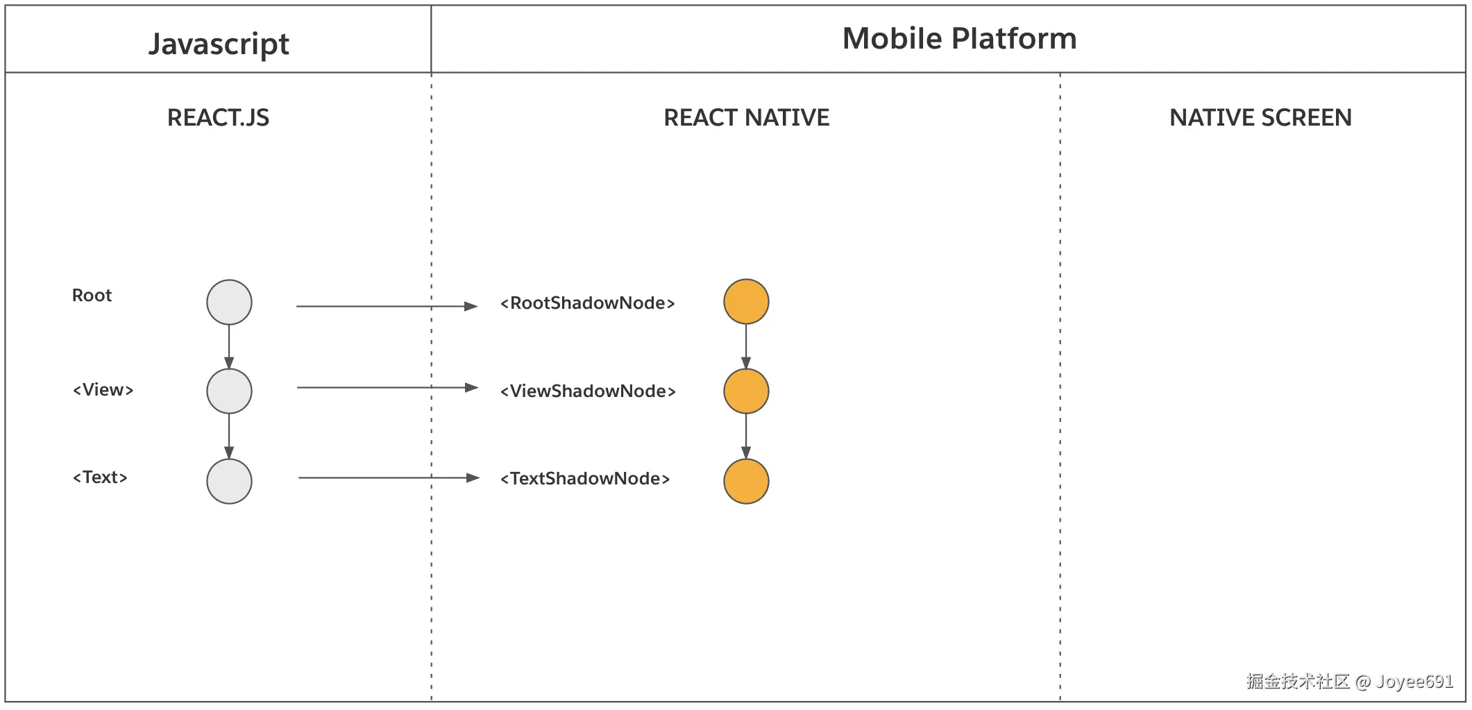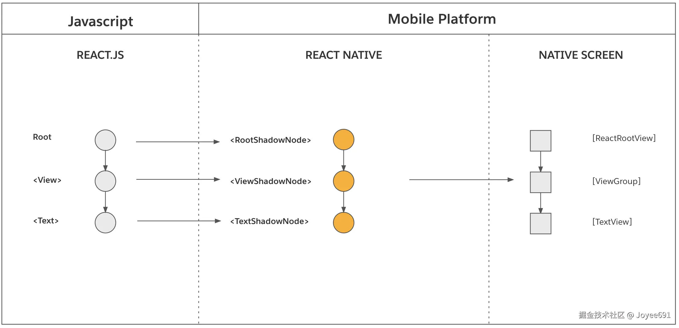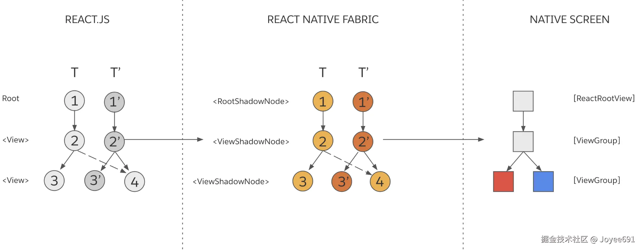 - 渲染 Render :描述了从 React 创建 React Element Tree 到 RN 基于该树创建 React Shadow Tree 的过程,最后的产物是 React Shadow Tree