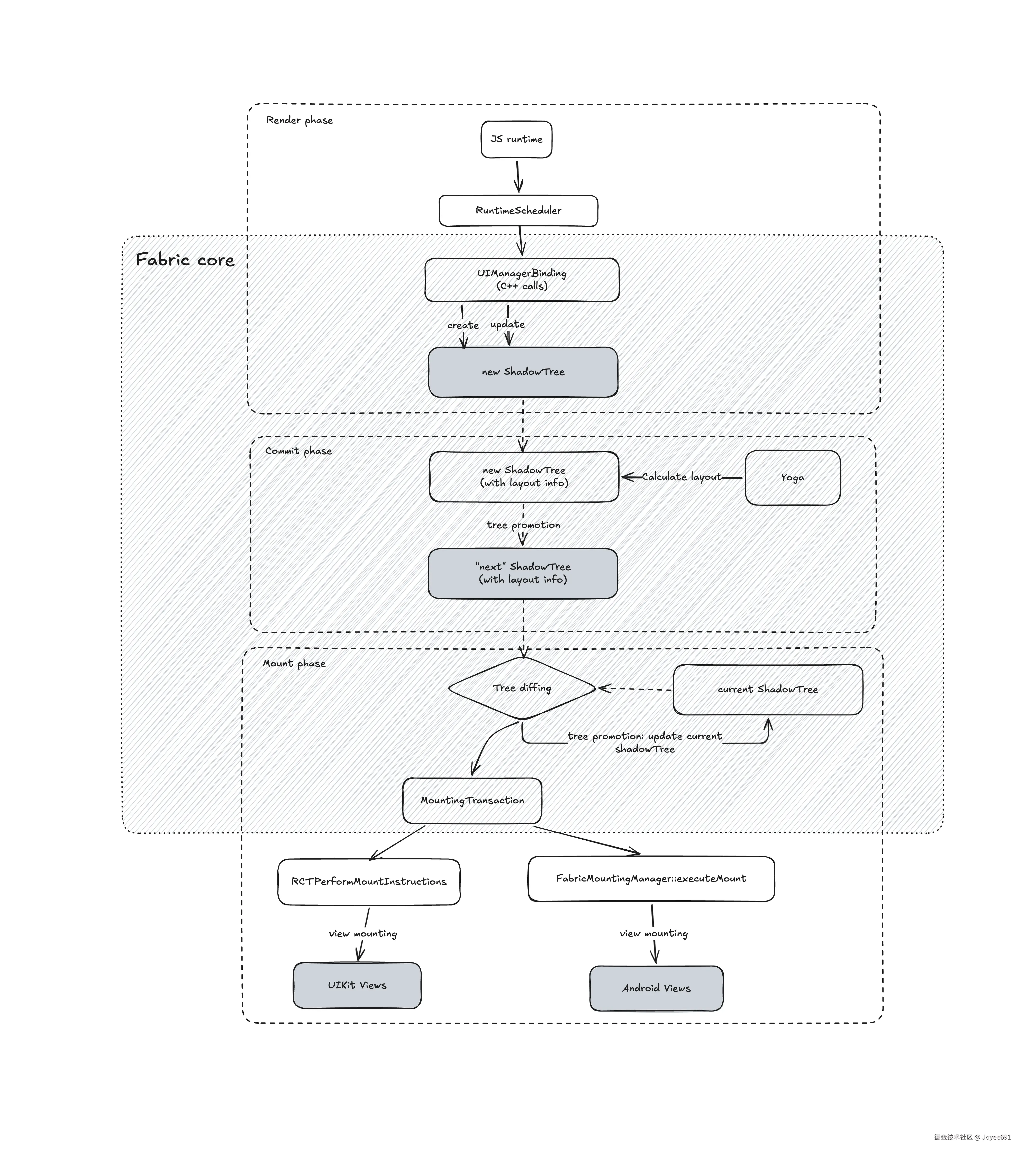 其内部的 shadow tree 构建、commit、mount 都是平台自己的实现,只有 layout 的部分有统一的 yoga 实现